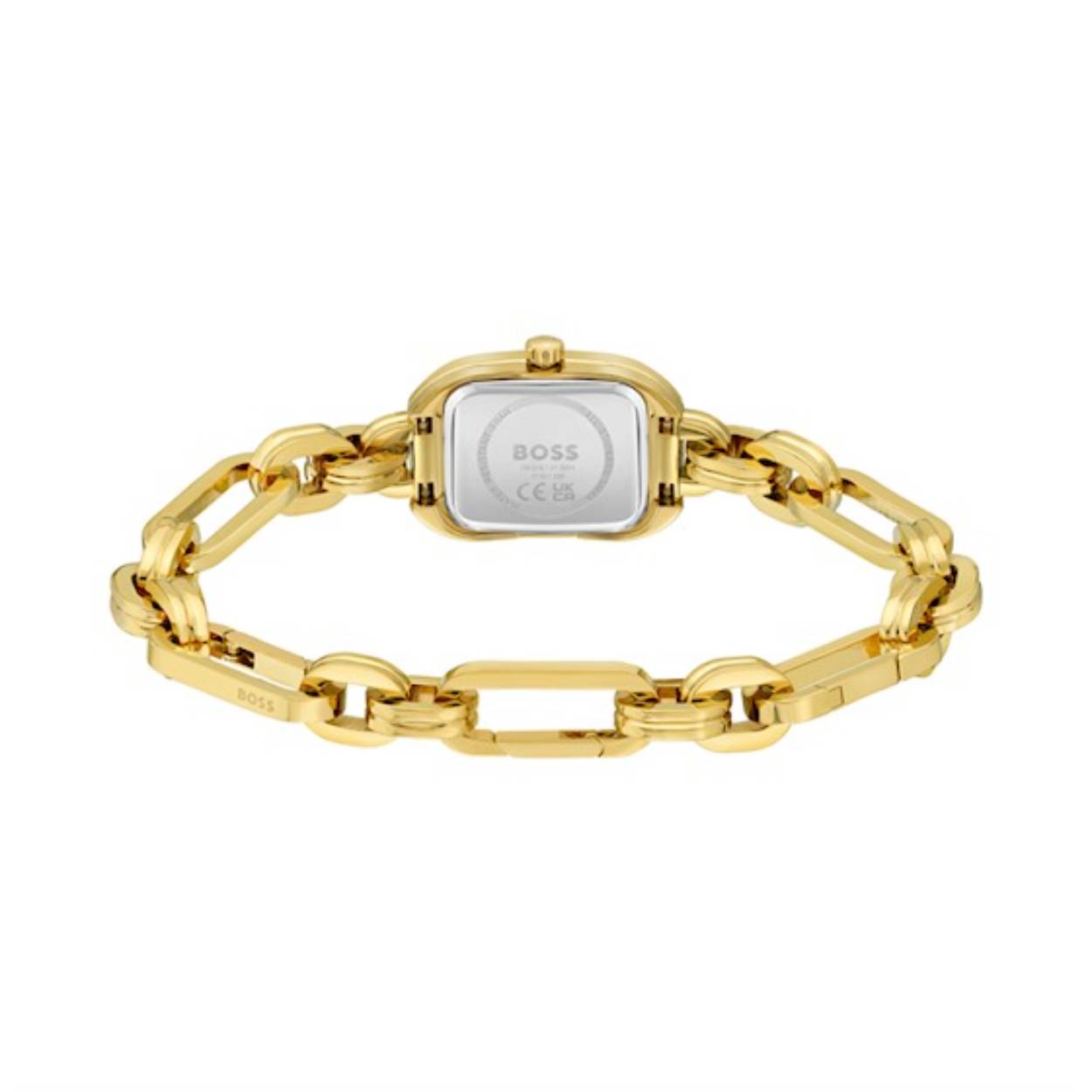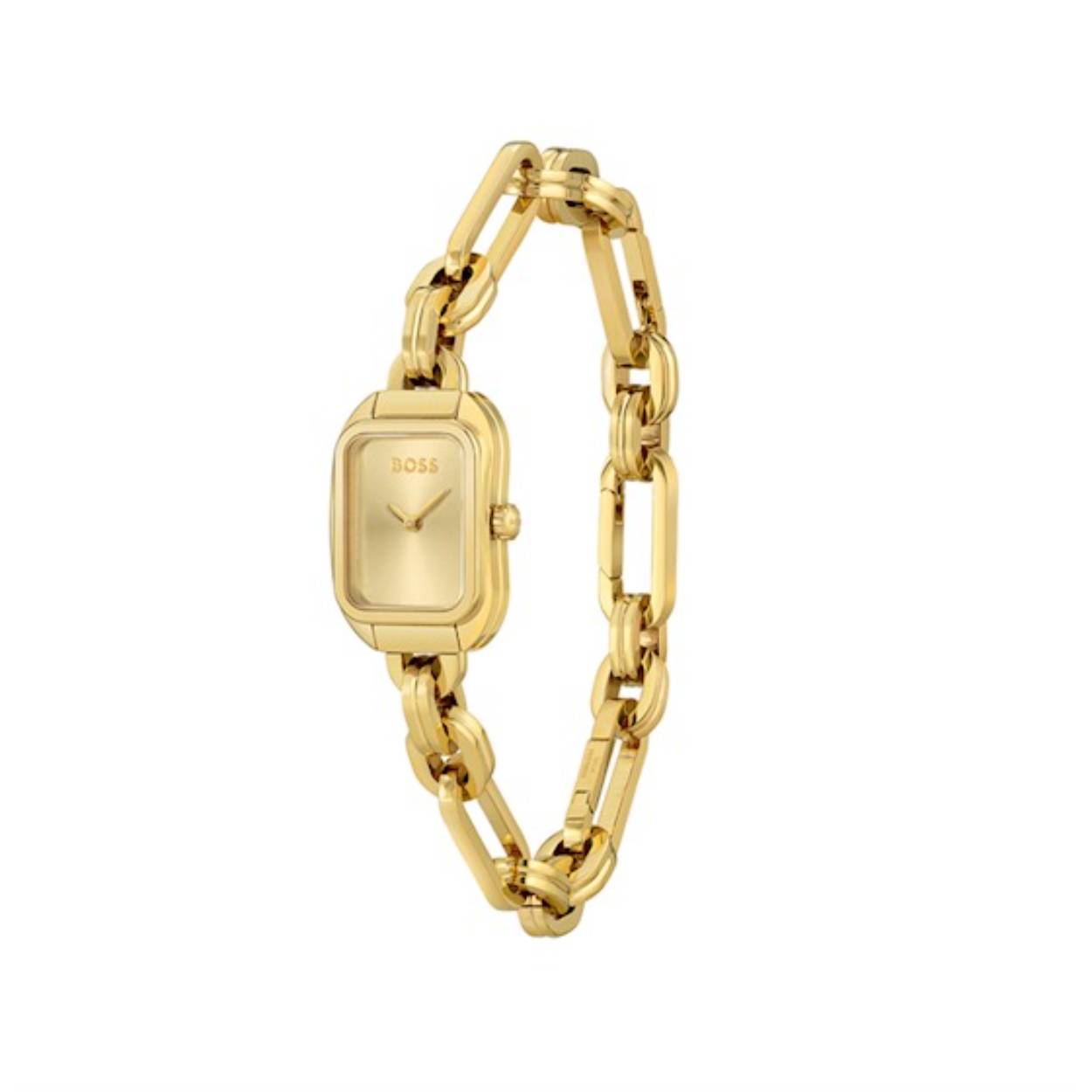 Dit BOSS horloge uit de Haily serie met artikelnr: HB1502655 is een apart strak model. Het dameshorloge valt op door zijn goudkleurige stalen rechthoekige horlogekast met een gladde rand en een goudkleurige wijzerplaat. De fijne wijzers in combinatie met het BOSS logo geven dit horloge een luxe uitstraling. Aan de kast zit een goudkleurige losse fantasie schakelband. De kast van het horloge heeft een afmeting van 19x28mm met een mineraalglas en is 3 ATM.