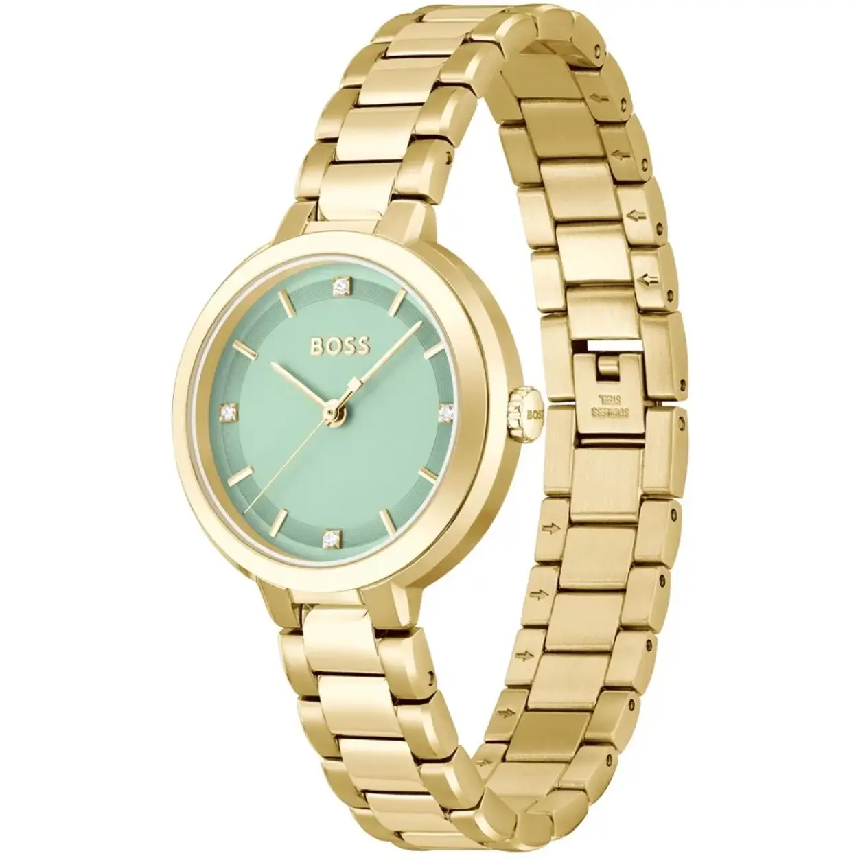 Dit BOSS horloge uit de SENA serie met artikelnr: HB1502759 heeft een chique look. Zeer geschikt voor de moderne stijlvolle vrouw van nu. Het dameshorloge valt op door zijn goudkleurige stalen ronde horlogekast met een platte goudkleurige bezel en een groene sunray wijzerplaat met op de 3,6,9 en 12 een kristal als uursaanduiding. Aan de kast zit een stalen goudkleurige schakelband met vouwsluiting. De kast van het horloge heeft een doorsnee van 34mm met mineraalglas en is 3ATM.
