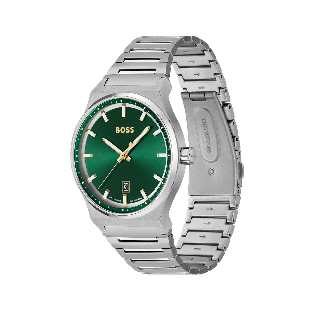 Dit BOSS horloge uit de CANDOR serie met artikelnr: HB1514079 heeft een luxe sport uitstraling. Zeer geschikt voor de moderne stijlvolle man van nu. Het herenhorloge valt op door zijn zilverkleurige stalen horlogekast met een gladde bezel en een groene wijzerplaat met een datum. De fijne wijzers en de fijne uursaanduiding geven dit horloge een chique uitstraling. Het horloge heeft lumibrite op de uurwijzers en op de uursaanduiding. Aan de kast zit een zilverkleurige stalen fijne schakelband met een vouwsluiting. De kast van het horloge heeft een doorsnee van 41mm met mineraalglas en is 5ATM.