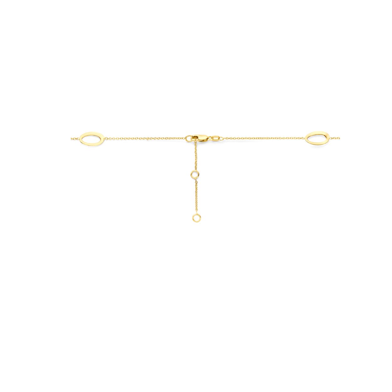 14k Geelgouden collier uitgevoerd met ovale elementen en een karabijn sluiting. Het collier heeft draaglengtes van 41, 43 en 45cm. De schakelbreedte is 1.2mm.