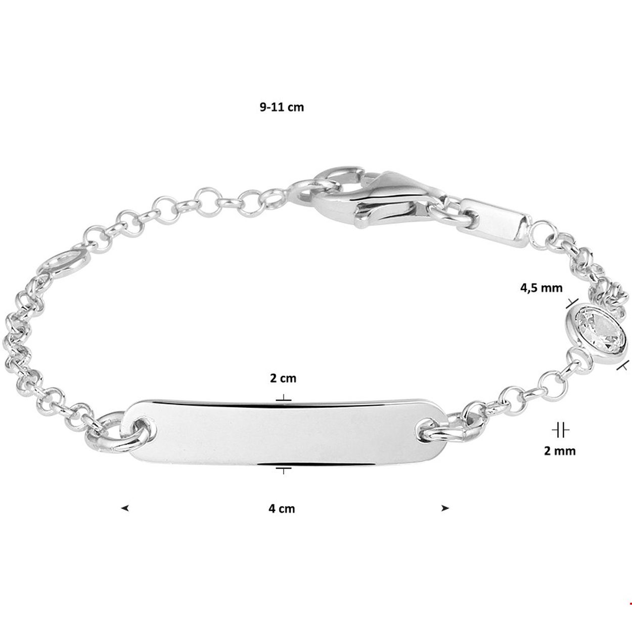 Beschrijving: Gerhodineerd zilveren kinder graveerarmband uitgevoerd met een plaat van 4x20mm, een karabijn sluiting en een heldere zirkonia. Info: Gerhodineerd zilver is door de rhodiumlaag beter bestand tegen verkleuren en krassen.
