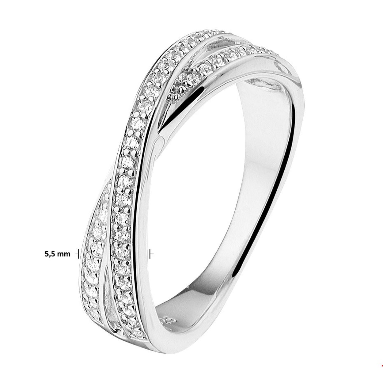 Beschrijving: Gerhodineerd zilveren ring uitgevoerd met een rij van heldere zirkonia. Info: Gerhodineerd zilver is door de rhodiumlaag beter bestand tegen verkleuren en krassen.