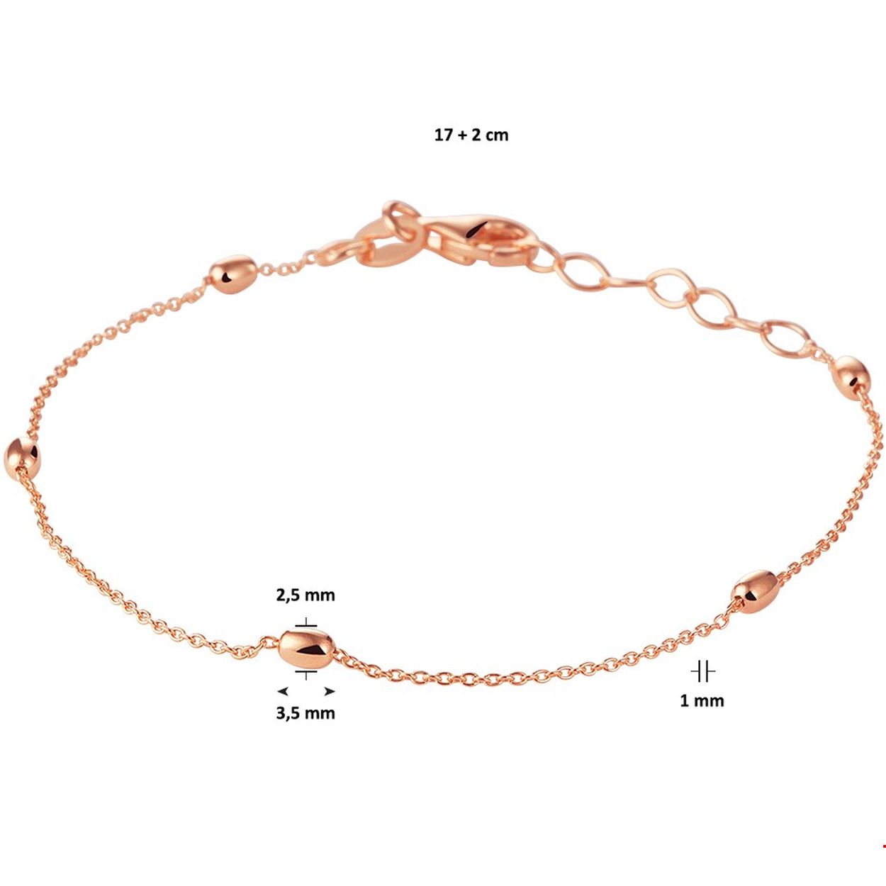 Beschrijving: Fijn rosegoud op zilveren bolletjes armband met een draaglengte van 17cm en een extensie van 2cm. Uitgevoerd met een anker schakel van 1.0mm en een stevige karabijn sluiting. De bolletjes hebben een afmeting van 2.5x3.6mm. De armband is te combineren met bijpassende sieraden uit onze collectie.