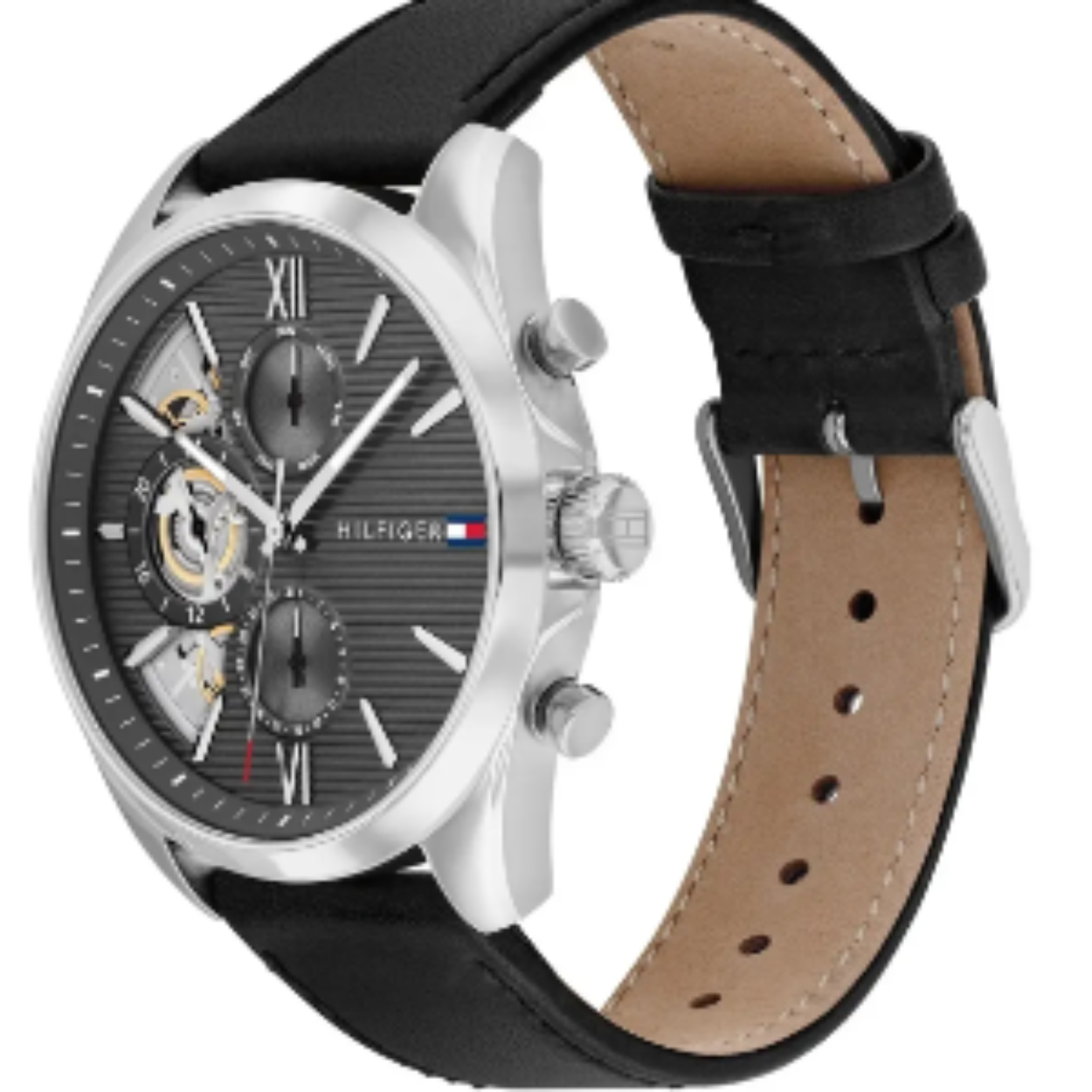 Dit specifieke horloge van Tommy Hilfiger uit de Baker serie met artikelnr: TH1710644 is een stoer herenhorloge die zeker in je collectie past. Het leren herenhorloge heeft een ronde zilverkleurige kast met een gladde bezel en een donkergrijze wijzerplaat met dag,- datum en 24-uursaanduiding en zilverkleurige wijzers en accenten. De zwarte lerenband is op lengte verstelbaar en heeft een gespsluiting. Het horloge heeft een mineraalglas, een doorsnee van 44mm en is 5ATM.
