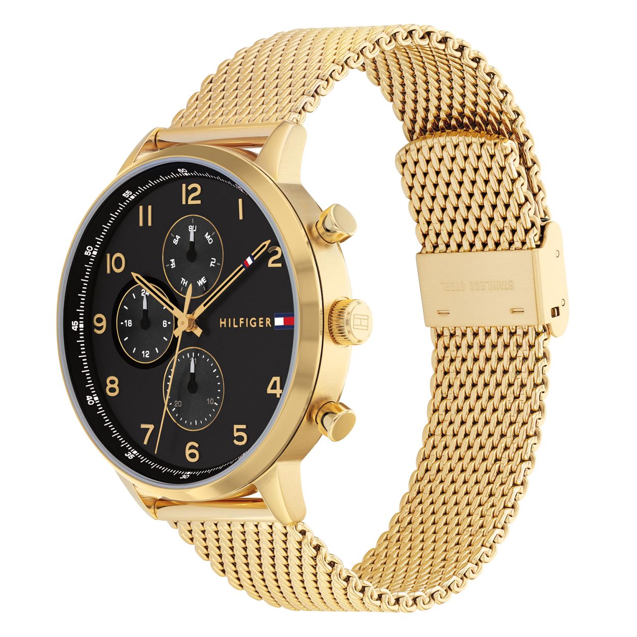 Dit unieke horloge van Tommy Hilfiger met artikelnr: TH1791989 is een casual horloge. Het stalen herenhorloge heeft een ronde goudkleurige kast met een zwarte bezel. Op de zwarte wijzerplaat zijn de dag datum en 24- uurs aanduiding zichtbaar in ronde uitsparingen en zijn de cijfers en wijzers goudkleurig. Aan het horloge zit een goudkleurige milanese band met druksluiting. Verder heeft het model een klassiek uiterlijk een mineraalglas een doorsnee van 44mm en is 5 ATM.